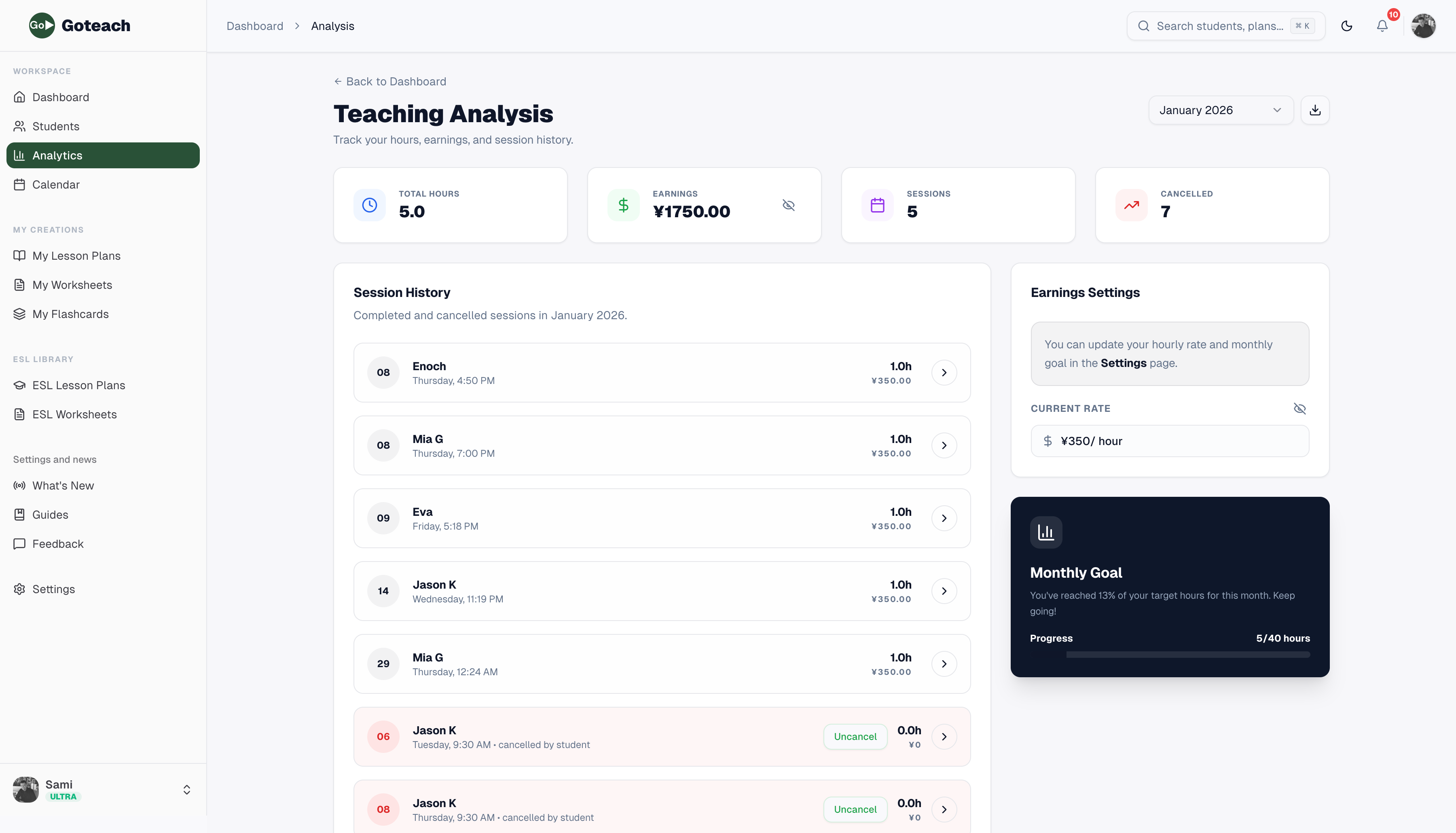 Set your hourly rate, track teaching hours, and download monthly reports for invoicing and tax purposes.