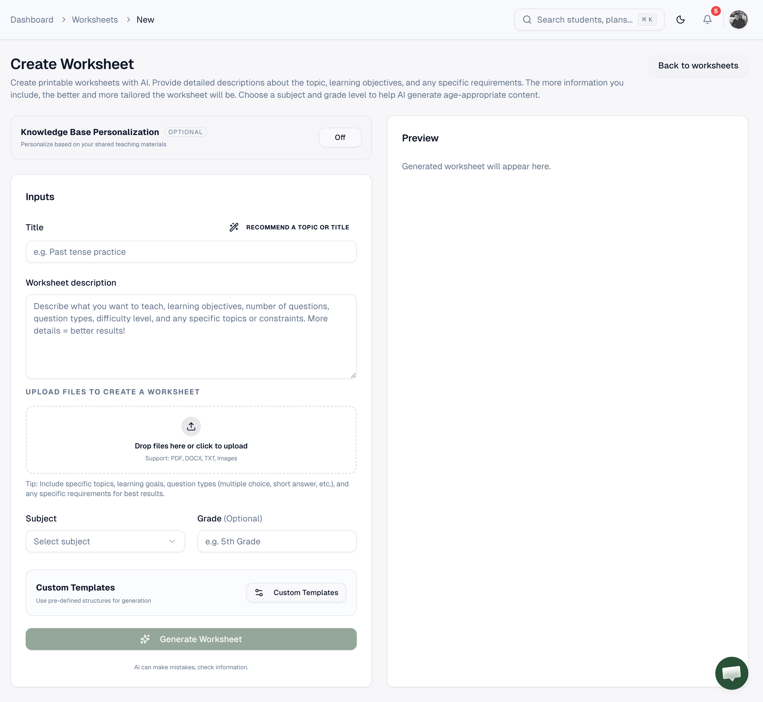 Drop PDFs, images, or documents to create worksheets based on specific materials you've been using in class.